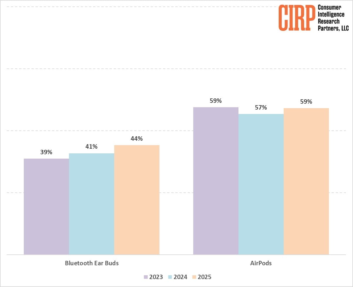 Согласно данным Consumer Intelligence Research Partners (CIRP), около 40% владельцев iPhone используют беспроводные наушники, и примерно 60% из них выбирают именно AirPods. Это значит, что в целом около 25% пользователей iPhone используют фирменные наушники Apple. Несмотря на то, что это число внушительное, оно не гарантирует лёгкого роста в будущем — особенно с учётом того, что конкуренция усиливается, а рынок Bluetooth-наушников в целом показывает признаки замедления.