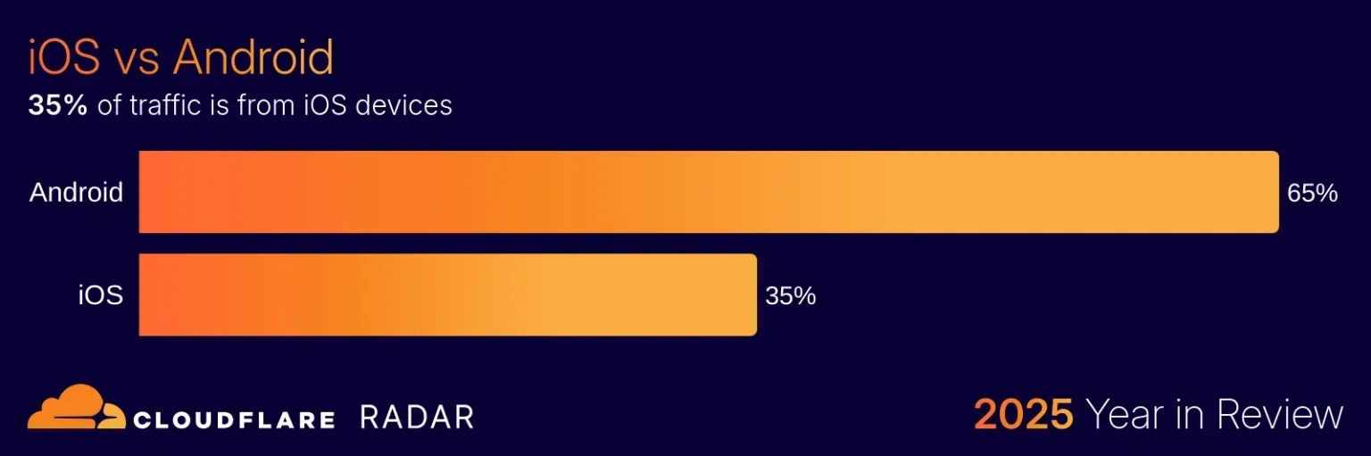 Аналитики отмечают, что по сравнению с предыдущим годом доля трафика с устройств Apple выросла на два процентных пункта. Cloudflare рассчитывает эти показатели, анализируя заголовки User-Agent в веб-запросах, что позволяет точно определить операционную систему клиента.