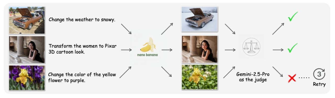 К таким редактированиям относятся перемещение объектов на изображении, добавление художественных эффектов, изменение масштаба и другие операции. Исследователи Apple загружали каждое изображение из набора в Nano-Banana вместе с соответствующей текстовой командой.