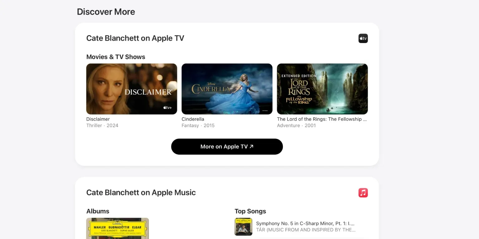 На англоязычной странице размещена горизонтальная карусель популярных персон. У каждого профиля есть кнопка Explore, ведущая на мини-страницу с биографией и собранным медиаконтентом: фильмами, сериалами, музыкой и подкастами. Например, страница Кейт Бланшетт включает её фильмы в Apple TV+, треки из фильма «Тар» в Apple Music и подкасты с её участием.