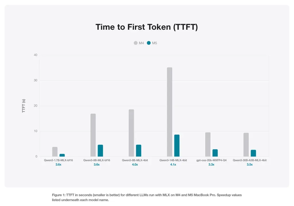 Для демонстрации прогресса инженеры сравнили время генерации на MacBook Pro с чипами M4 и M5. Тесты проводились на моделях с открытым кодом: