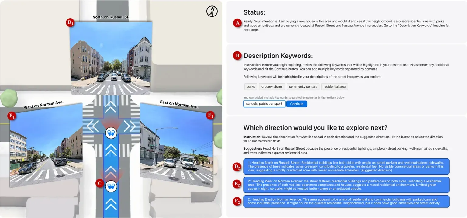 - Virtual Exploration: свободное исследование района — пользователь указывает, что ищет (например, тихий квартал с парком), а система описывает улицы и помогает «прогуляться» виртуально.
