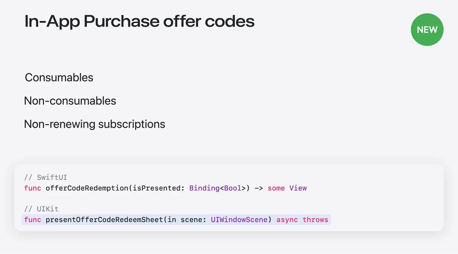 Промокоды можно будет активировать как внутри приложения с помощью offerCodeRedemptionAPI, так и через системный интерфейс с помощью presentOfferCodeRedeemSheet в приложениях на UIKit.