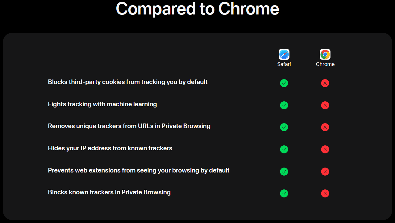 В качестве доказательства Apple представила сравнительную таблицу, где по каждой из позиций (защита от трекеров, фильтрация вредоносного кода, маскировка IP) положительные отметки стоят только напротив Safari. Chrome в этом списке не показал ни одной функции, соответствующей заявленному уровню защиты.