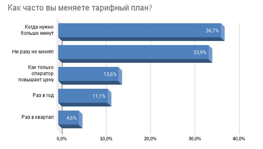 Почти 40% респондентов периодически меняют тарифный план, чтобы получить больше минут для общения. Однако более трети (34%) никогда не меняли пакеты услуг. При этом более 13% опрошенных пересматривают тарифы в случае повышения цен со стороны операторов, а 11% уделяют этому вопросу внимание не чаще, чем раз в год. Лишь 5% участников опроса внимательно следят за обновлениями и меняют тарифы ежеквартально.