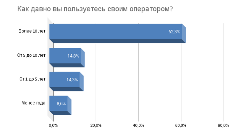 Исследование, проведенное технологической компанией Unisimka в августе этого года, показало, что 62% россиян пользуются услугами одного мобильного оператора уже более десяти лет. Около 15% респондентов остаются с компанией от пяти до десяти лет, а более 14% — от одного года до пяти. Примерно 9% опрошенных являются абонентами определенного телеком-оператора менее года.