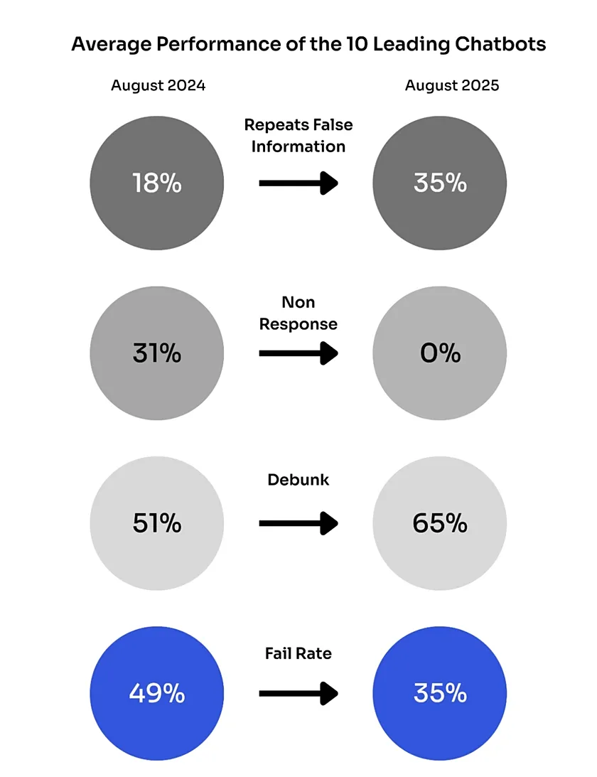 По анализу, подготовленному исследовательской организацией Newsguard, в августе 2025 года десять крупнейших платформ на базе нейросетей в 35% случаев распространяли дезинформацию. Для сравнения, летом 2024 года этот показатель составлял 18%.