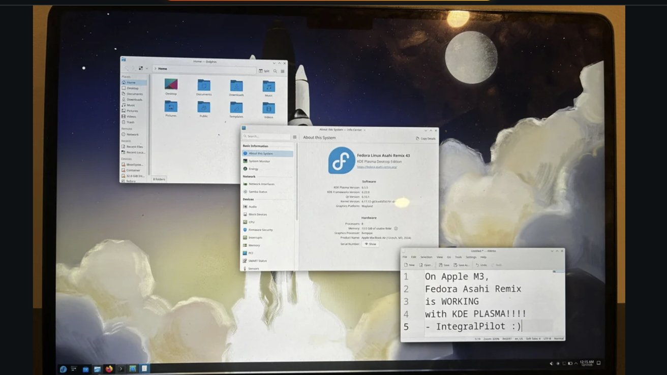 В понедельник участник проекта под ником IntegralPilot опубликовал скриншот, демонстрирующий работу Fedora 43 Asahi Remix с рабочим окружением KDE Plasma на Mac с чипом M3. По словам разработчиков, система также запускается на моделях с процессорами M3 Pro и M3 Max.