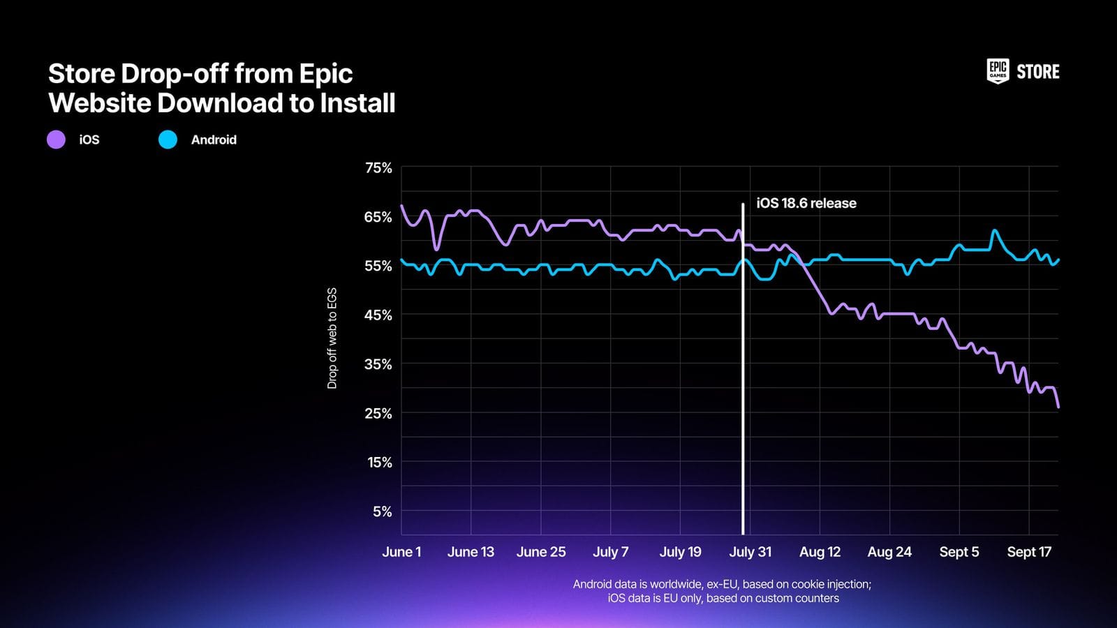 По данным разработчика Fortnite, после выхода iOS 18.6 количество шагов при установке Epic Games Store сократилось с 15 до 6. В результате число пользователей, отказывавшихся завершить процесс, снизилось с 65% до 25%. Apple также убрала так называемые «экраны запугивания», предупреждавшие о рисках загрузки приложений не из App Store.