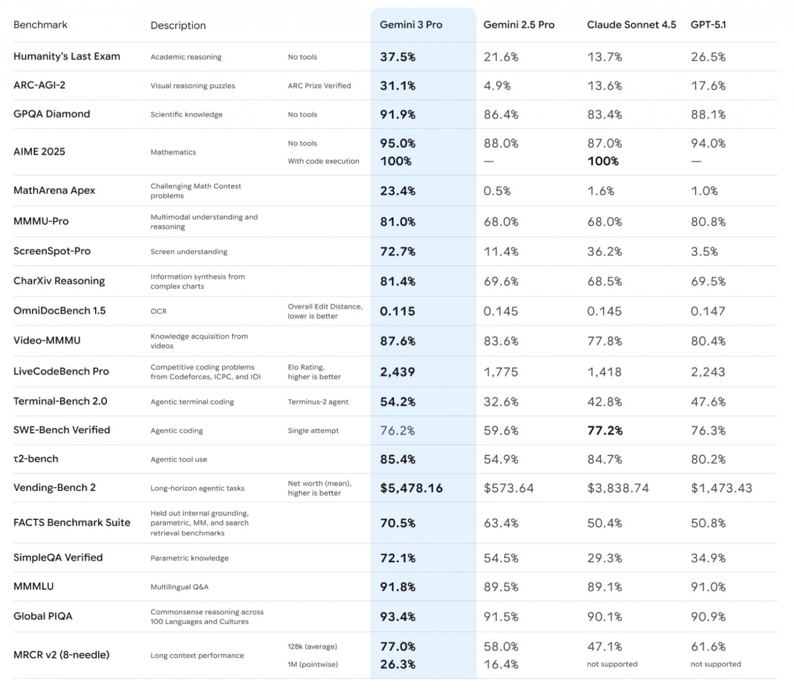 Gemini 3 Pro достигла результата в 1501 балл на LMArena, превзойдя Gemini 2.5 Pro (1451 балл), которая до этого занимала лидирующую позицию. Новая модель значительно опережает свою предшественницу во всех основных тестах: