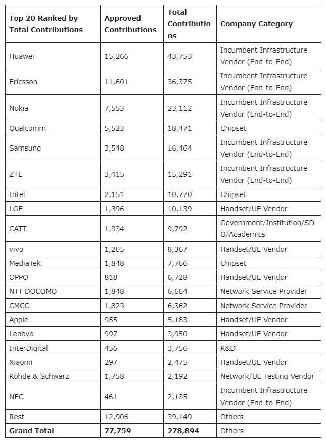 Однако стоит отметить, что вклад в стандарт 3GPP вносят более 400 компаний и организаций, среди которых наиболее активными являются производители сетевого оборудования. Кроме того, в настоящее время во всём мире объявлено более 210 000 патентов, необходимых для стандарта 5G, причём 40% из них приходится на Китай, что делает его мировым лидером в разработке патентов 5G.
