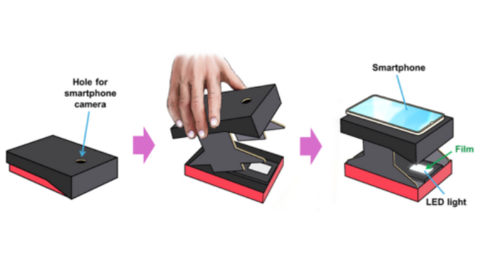 Они создали компактный складной сканер с подсветкой, куда помещается облучённая плёнка. Камера смартфона фиксирует изображение, а встроенное приложение анализирует цветовой профиль и вычисляет численное значение дозы.