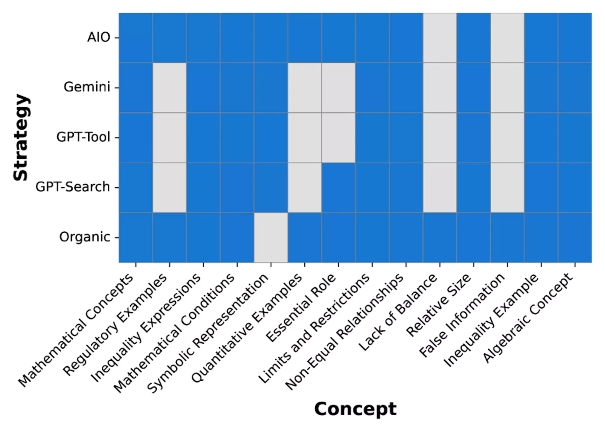 Анализ содержания показал, что несмотря на использование более широкого спектра источников, ИИ-системы покрывают примерно такое же количество тематических концепций, что и традиционный поиск. Однако здесь кроется важный нюанс — каждая система подаёт разные информационные аспекты. Некоторые концепции, которые охватывает традиционный поиск, могут быть упущены генеративными системами, особенно когда речь идёт о неоднозначных запросах или вопросах, требующих рассмотрения множества разных точек зрения.