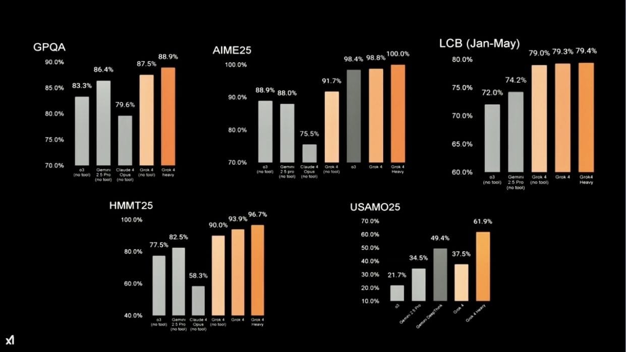 Среди продемонстрированных возможностей Grok 4 — абсолютная точность в тесте AIME 25, используемом в американских математических олимпиадах. Модель дала 100% правильных ответов.