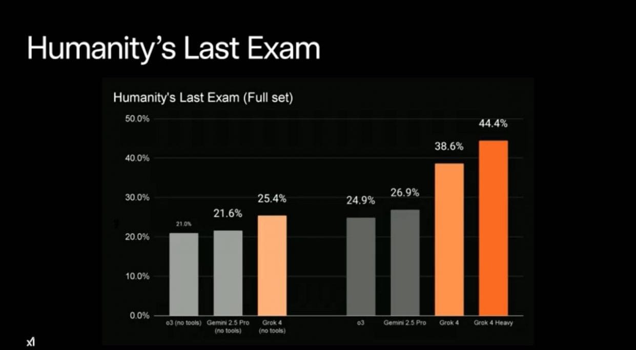 В сложнейшем тесте Humanity’s Last Exam, который предполагает коллективную работу ИИ-агентов, результат составил 44,4%. Даже без многоагентного режима Grok 4 показала 25% — больше, чем любые другие известные модели.
