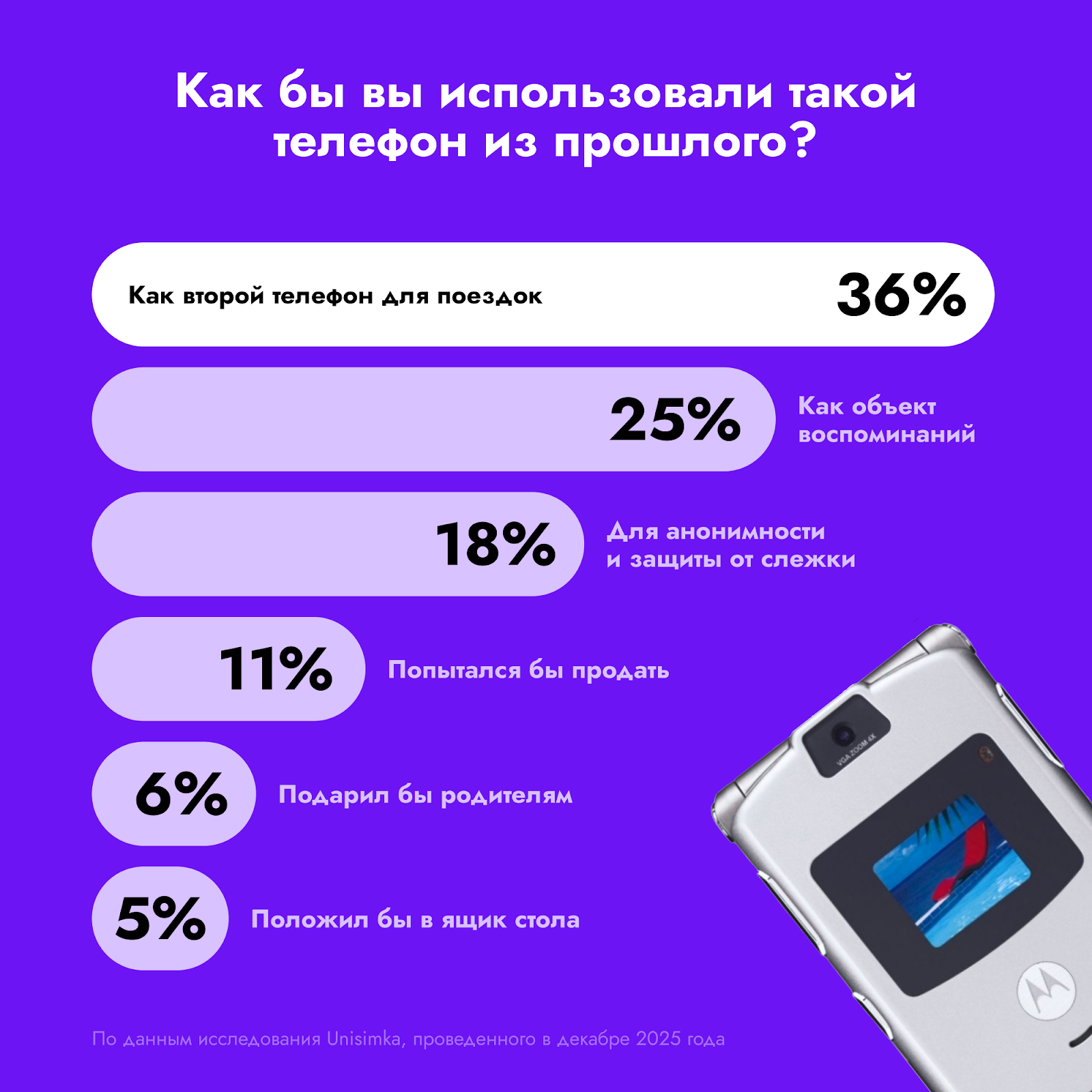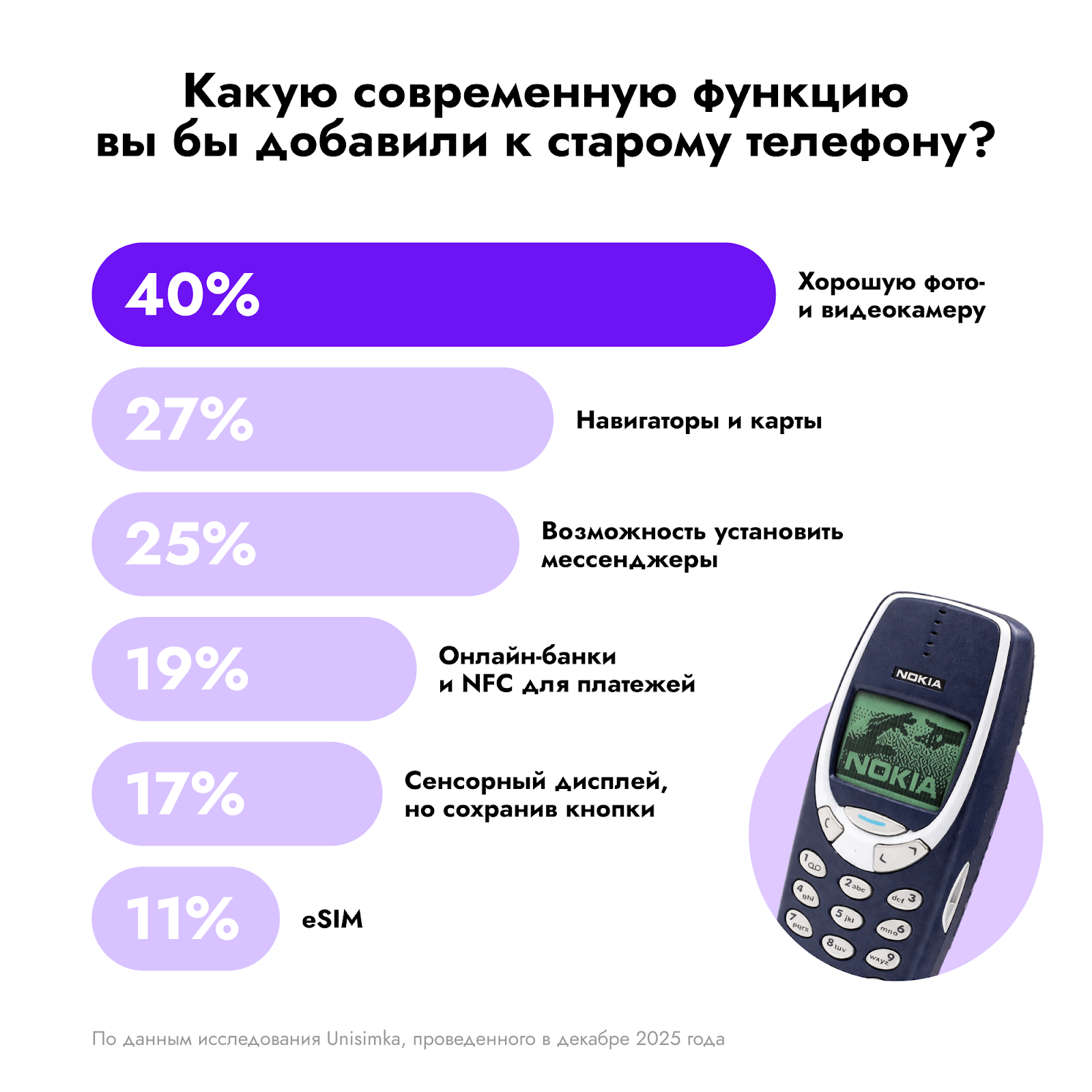 Компания UNISIMKA, производитель модуля для апгрейда телефонов до версии с поддержкой eSIM, провела исследование, чтобы выяснить, как россияне относятся к телефонам из прошлого и зачем они их используют. Результаты показали, что более половины опрошенных были бы рады получить такой телефон в подарок. При этом около трети отдали бы предпочтение «неубиваемым» моделям, которые ассоциируются с надежностью, долговечностью и возможностью отдохнуть от цифровой перегрузки.