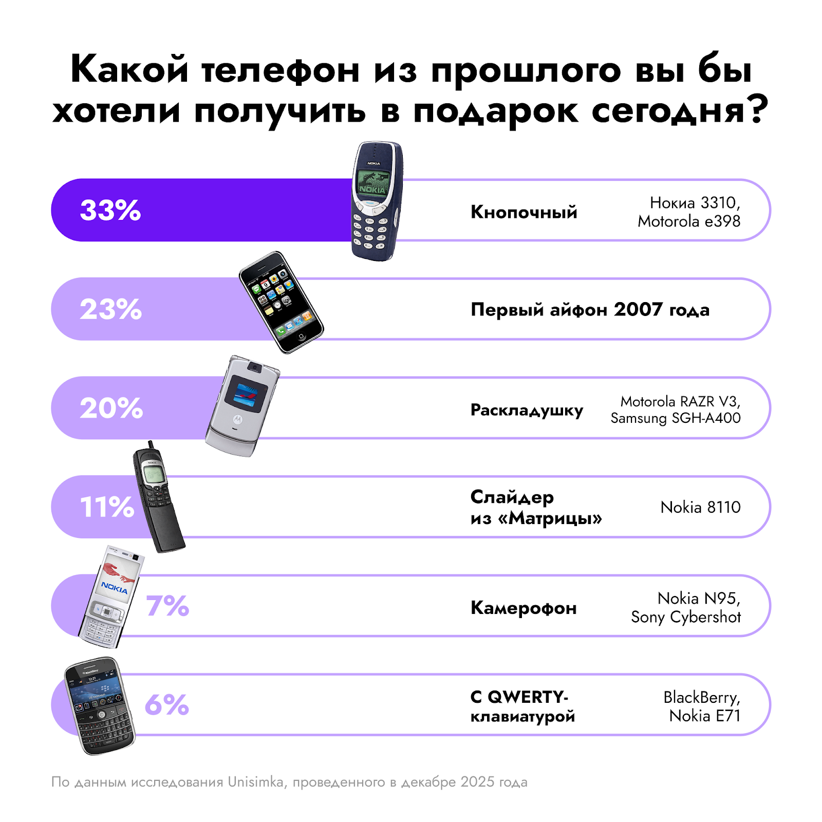 Среди прочих фаворитов — слайдер Nokia 8110 из фильма «Матрица» (11%) и камерофоны начала 2000-х, такие как Nokia N95 и Sony Cybershot (7%) и модели с QWERTY-клавиатурой (BlackBerry, Nokia E71): их предпочли бы получить в подарок 6% респондентов.