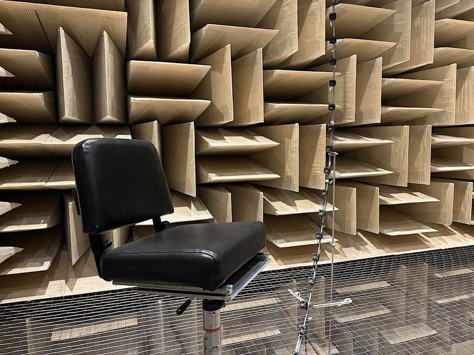 Самое странное и завораживающее место в лаборатории — безэховая камера. Это комната внутри комнаты: полностью изолированная от внешних вибраций и шума. Стены, потолок и даже пол здесь покрыты клиньями из звукопоглощающей пены. Пол здесь — тоже из клиньев, так что ходить приходится по подвесной решётке, словно по мосту.