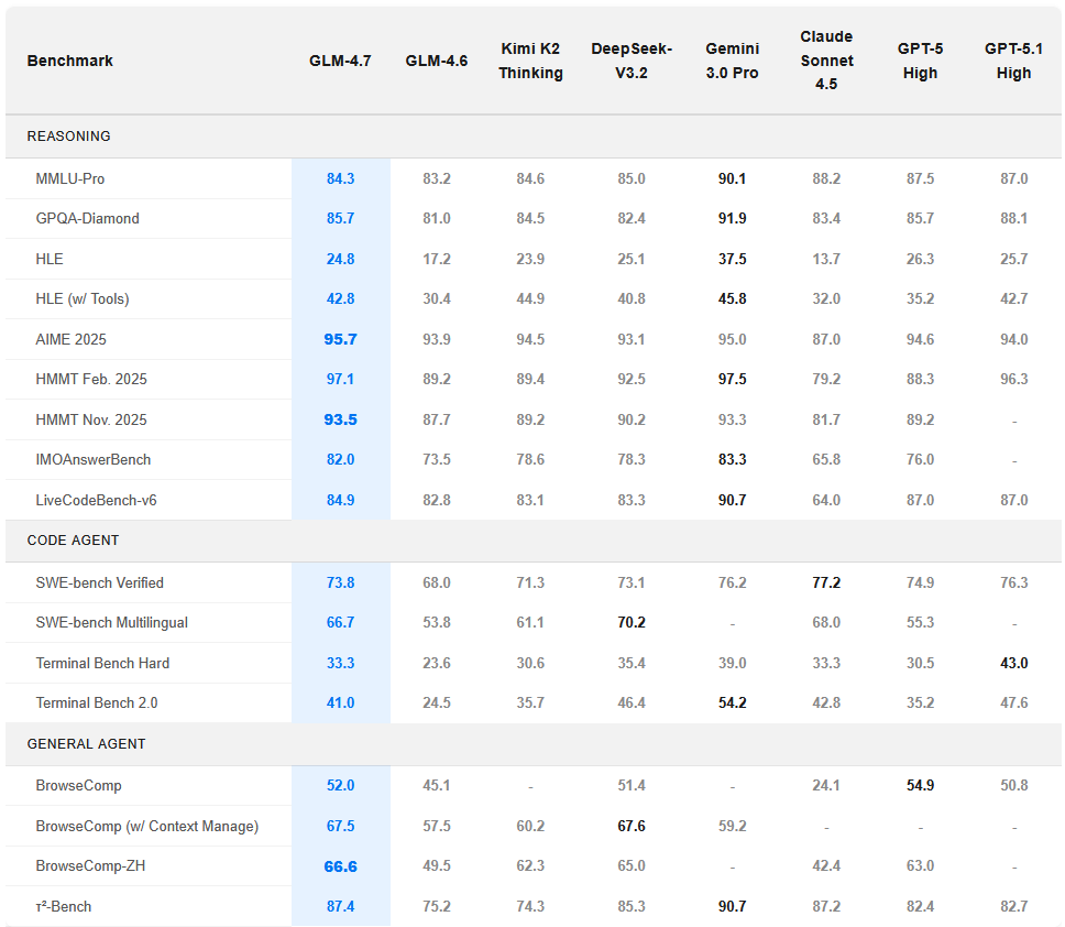 В сравнительной таблице модель сопоставлена с конкурентами вроде GPT-5, GPT-5.1, Claude Sonnet 4.5, Gemini 3.0 Pro и DeepSeek-V3.2. Хотя она не занимает верхние строчки во всех метриках, по ряду позиций GLM-4.7 уверенно входит в лидирующую группу и по отдельным направлениям опережает конкурентов.