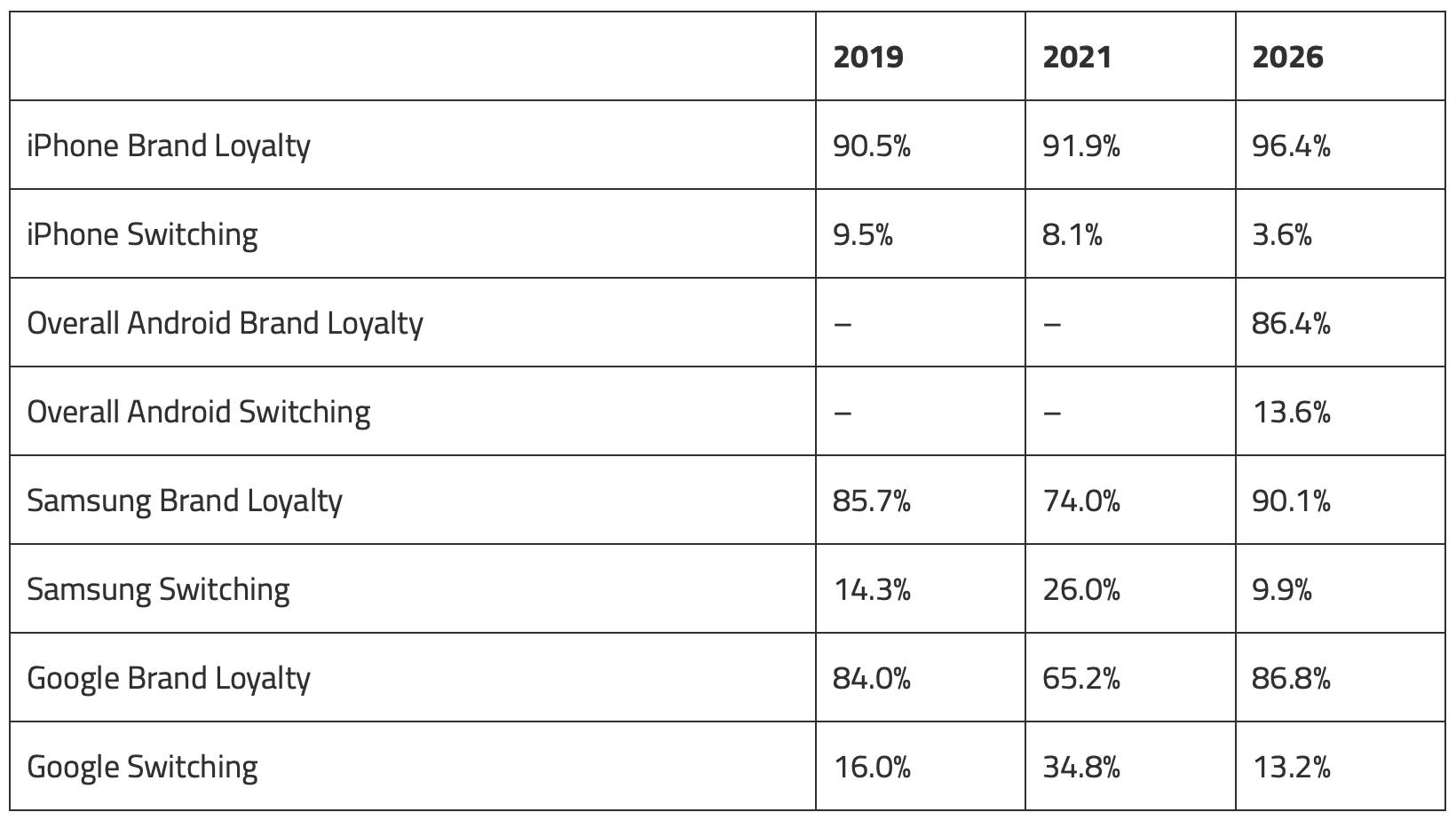 Аналитики SellCell также проследили, как менялся уровень привязанности к брендам с течением времени. Данные показывают устойчивый рост лояльности к iPhone: если в 2019 году этот показатель составлял 90,5%, то к 2026 году он достиг рекордных 96,4%. Примечательно, что основной скачок роста пришёлся на период после 2021 года.