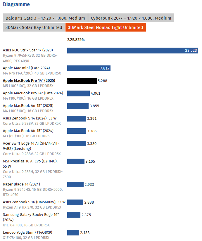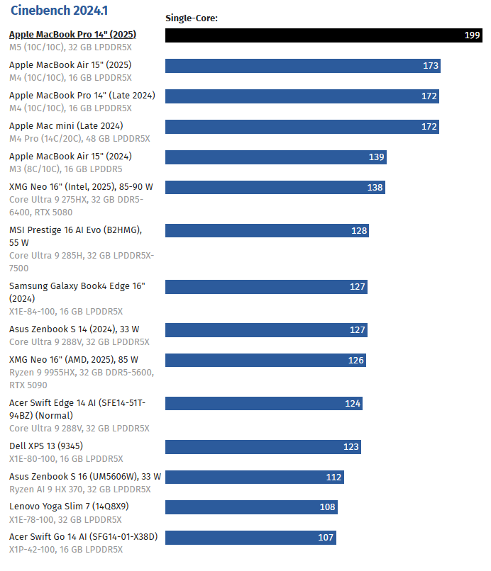 Немецкое издание ComputerBase провело комплексное тестирование обновлённого MacBook Pro с диагональю 14 дюймов и процессором M5. В результате ноутбук показал рекордную производительность на одно ядро среди всех мобильных и настольных процессоров.