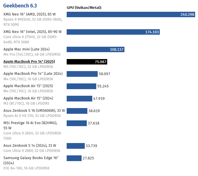 Чип M5, созданный с использованием техпроцесса TSMC N3P, получил переработанный контроллер памяти с поддержкой LPDDR5X-9600, более производительное графическое ядро и ускоренный SSD. Максимальная частота достигает 4,61 ГГц. В Cinebench 2024 результат составил 199 баллов — выше, чем у Intel Core Ultra 9 285K (149 баллов) и AMD Ryzen 9 9950X3D (140 баллов). В Geekbench 6 ноутбук набрал 4325 баллов, опередив предшественника M4 Pro примерно на 13%.