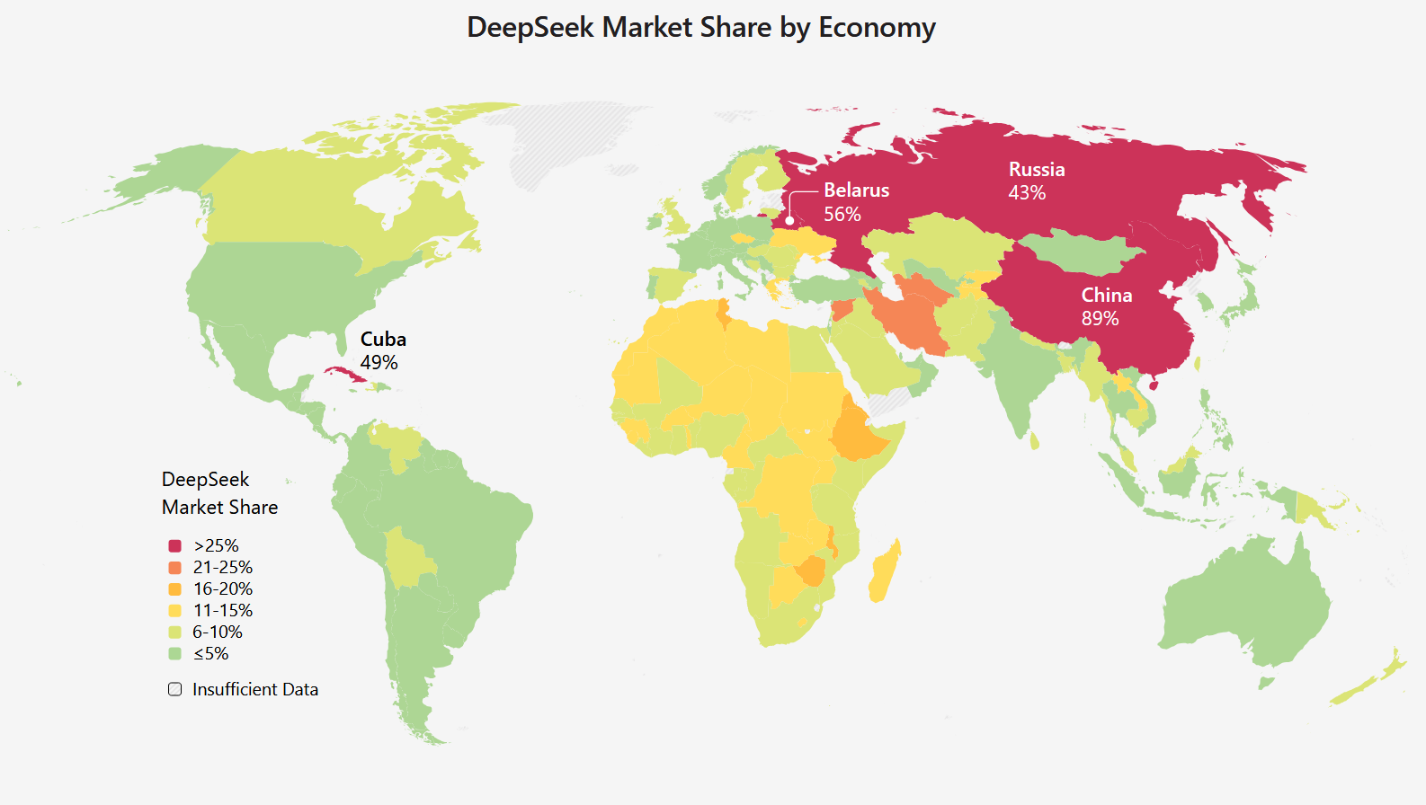 DeepSeek демонстрирует бурный рост в странах, находящихся под санкциями или имеющих сложные отношения с Западом. Согласно данным отчёта, наибольшую долю рынка китайская нейросеть занимает в следующих странах: