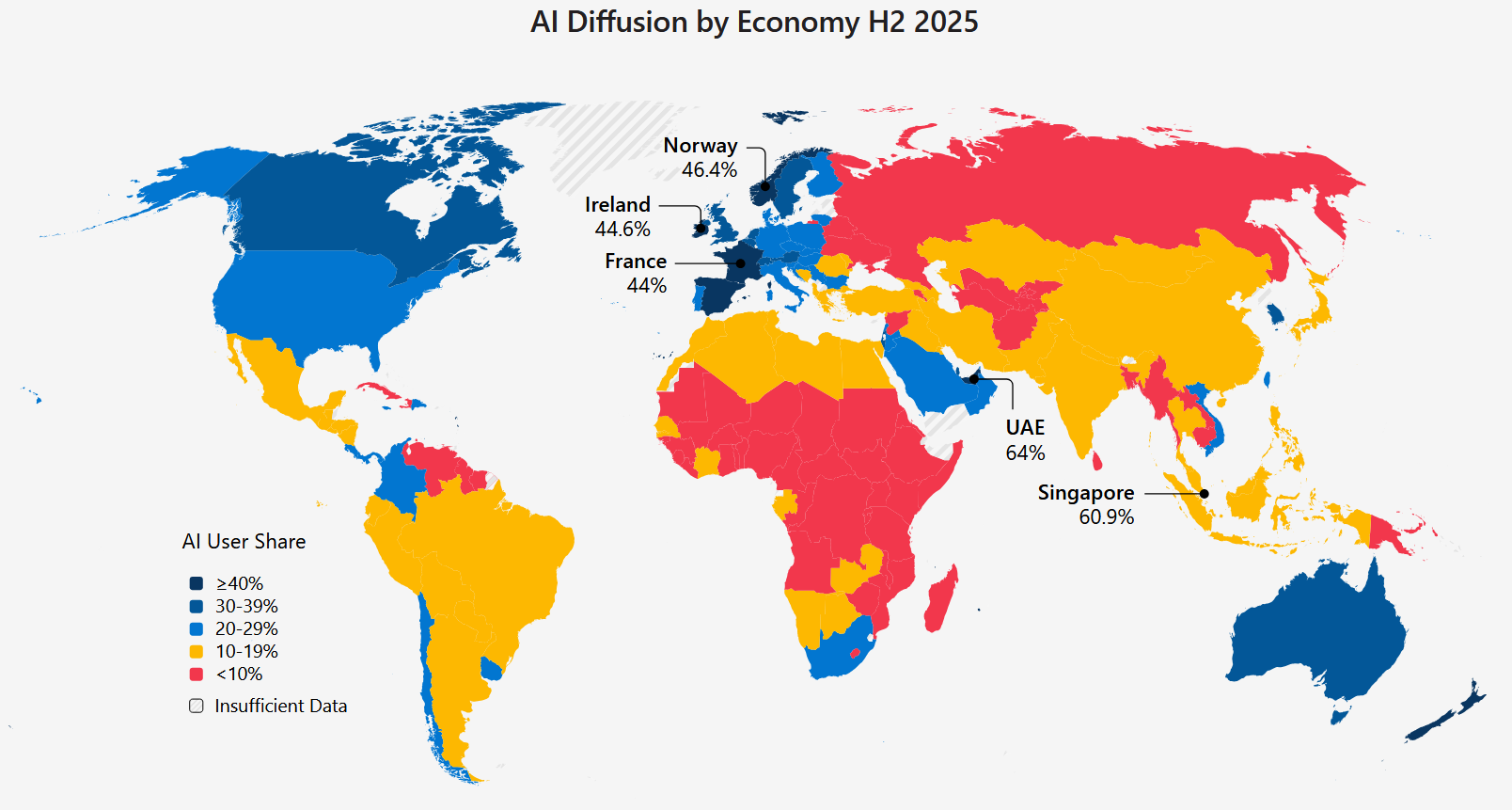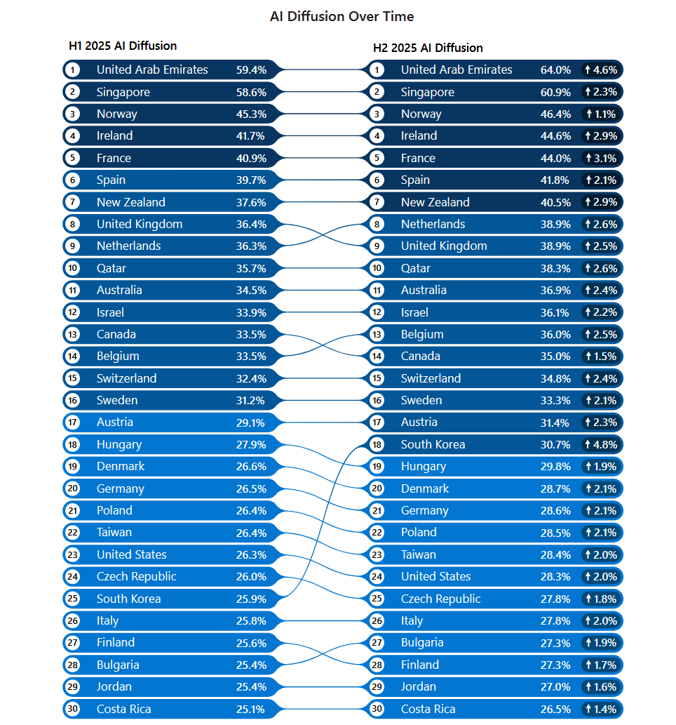 Отчёт Microsoft за второе полугодие [PDF] 2025 года фиксирует занимательную тенденцию: несмотря на рекордный рост использования нейросетей, цифровой разрыв между богатыми и развивающимися странами увеличивается. Пока Южная Корея совершает технологический рывок благодаря GPT-5 и вирусным трендам, Африка и Россия всё чаще выбирают альтернативный путь с DeepSeek.