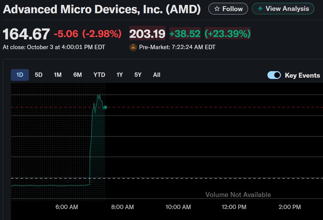После публикации информации о партнёрстве с OpenAI стоимость акций AMD увеличилась более чем на 24%.