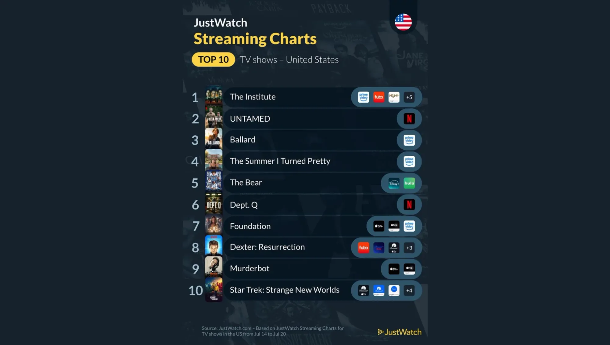 Кроме того, научно-фантастическая экшен-комедия «Киллербот» от Apple TV+ продолжает удерживать аудиторию даже после завершения первого сезона.