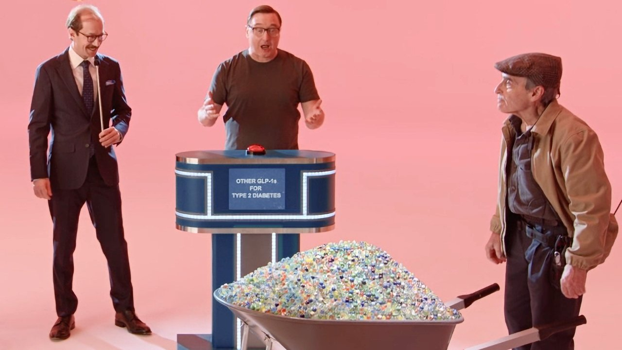 Видео начинается с мучительно затянутого 45-секундного сегмента в стиле телевикторины. В битве сходятся «Оземпик» (в исполнении Джастина Лонга) и «Другой препарат ГПП-1 для лечения диабета 2-го типа» (которого играет Джон Ходжман). Ведущий задаёт простой вопрос об одобрении лекарств. Персонаж Ходжмана с энтузиазмом отвечает, но тут же понимает, что ненароком прорекламировал своего конкурента – «Оземпик».