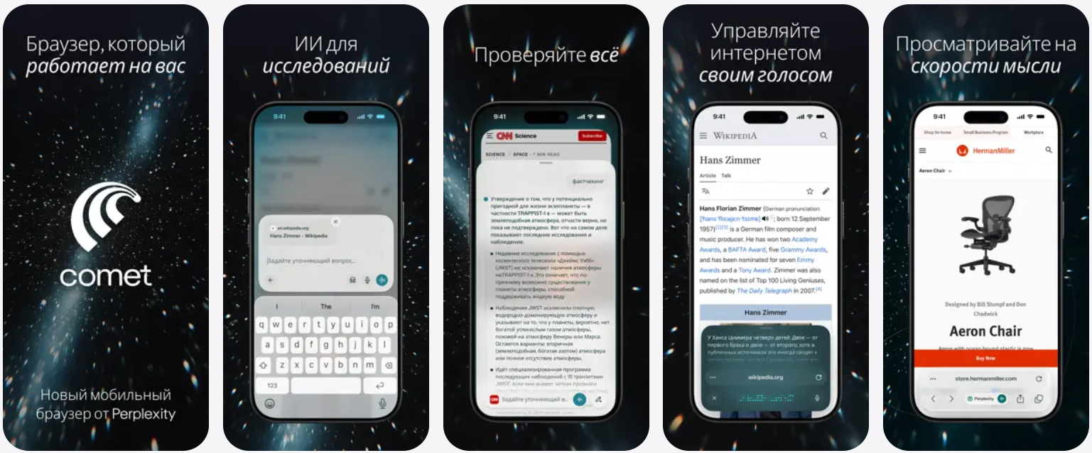 Comet позиционируется как браузер-ассистент: он объединяет поиск на базе Perplexity, чат с ИИ и автоматизацию задач прямо внутри интерфейса. По описанию из App Store, браузер умеет делать резюме страниц, помогать с покупками, управлять расписанием и вести исследования – всё это без перехода в сторонние приложения.