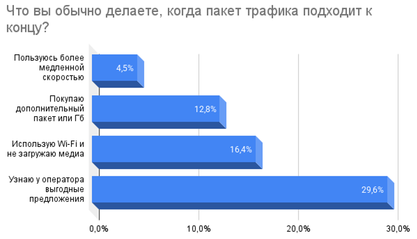 Когда пакет интернета подходит к концу, более трети россиян (37%) просто ждут начала нового периода, а 30% обращаются к оператору за выгодными предложениями. Переходят на Wi-Fi и ограничивают загрузку медиафайлов 16% абонентов, а 5% и вовсе вынуждены пользоваться более медленной скоростью. Лишь 13% респондентов готовы докупить дополнительные гигабайты.