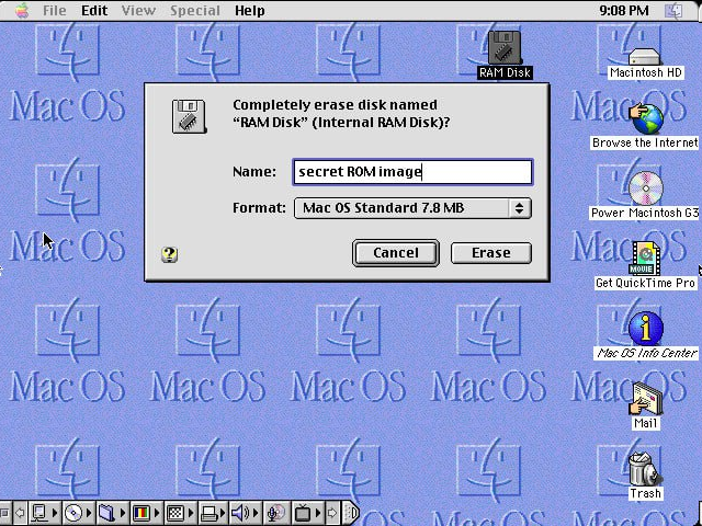 - Выберите иконку RAM-диска и отформатируйте его через меню «Стереть диск», введя в поле имени фразу «secret ROM image».