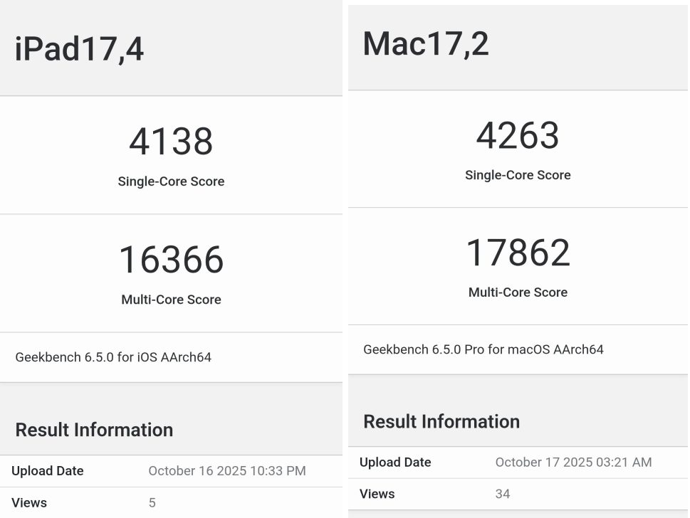 По данным бенчмарков Geekbench, процессор M5 в iPad Pro набрал 4138 баллов в одноядерной нагрузке. Аналогичный чип в MacBook Pro показал результат 4263 балла — разница составила всего 3%.