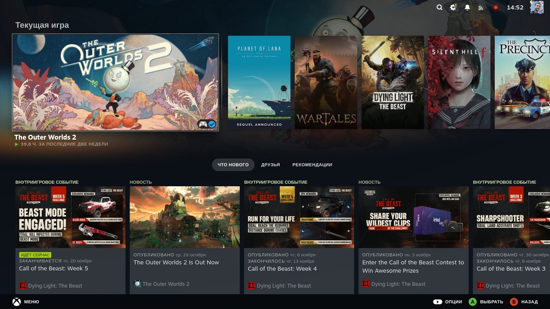 Выглядит знакомо: библиотека игр, магазин, друзья, настройки. Управление работает c геймпадом (я взял свой 8BitDo Ultimate), курсор плавно скользит по меню. Ощущение как на Steam Deck или PlayStation. Круто!