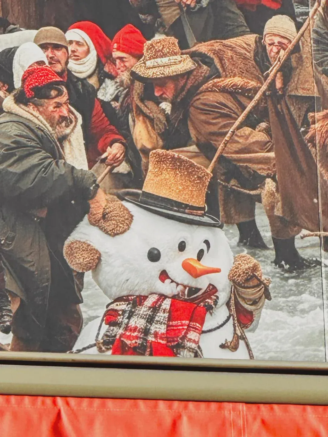 Вот такие весёлые праздники. Это знак того, что даже праздничные украшения больше не защищены от волны ИИ-халтуры, причём ещё и устаревшей: современные генераторы изображений достигли больших успехов в целостности картинки и обеспечении правильного количества пальцев у людей. Это заставляет задуматься, не было ли панно создано с помощью уже "древних" инструментов.