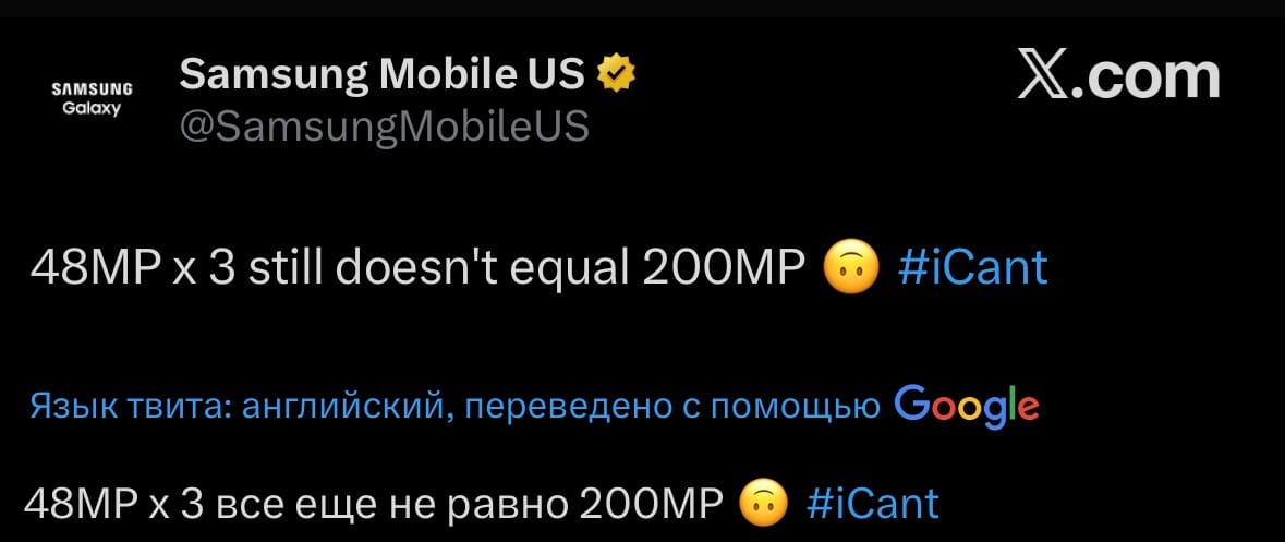 В другом посте компания язвительно напомнила: «Три камеры по 48 Мп — всё ещё не 200 Мп», намекая на то, что iPhone 17 Pro и 17 Pro Max оснащены тройной камерой с сенсорами по 48 Мп, в то время как Galaxy S25 Ultra и S25 Edge уже используют основной модуль на 200 Мп.