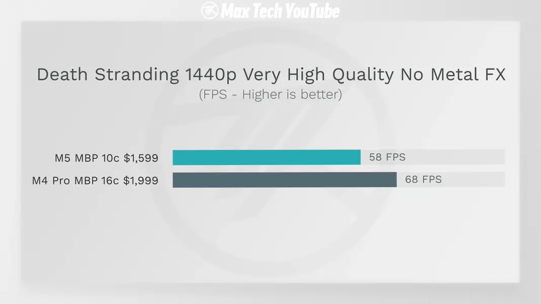 Несмотря на ожидаемый прирост, модель на M5 уступила M4 Pro в большинстве тестов. Особенно заметным оказался разрыв в игровом сценарии. В игре Death Stranding при разрешении 1440p и максимальных настройках без Metal FX ноутбук на M4 Pro показывал на 17% больше кадров в секунду.