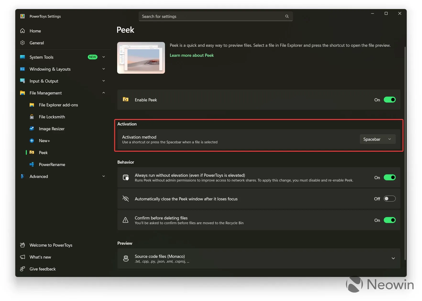 Чтобы воспользоваться новой функцией, потребуется обновить PowerToys до версии 0.95, затем в параметрах перейти в раздел Settings → File Management → Peek и выбрать пробел в пункте Activation method. После этого предпросмотр можно будет запустить одним нажатием клавиши, без дополнительных комбинаций.