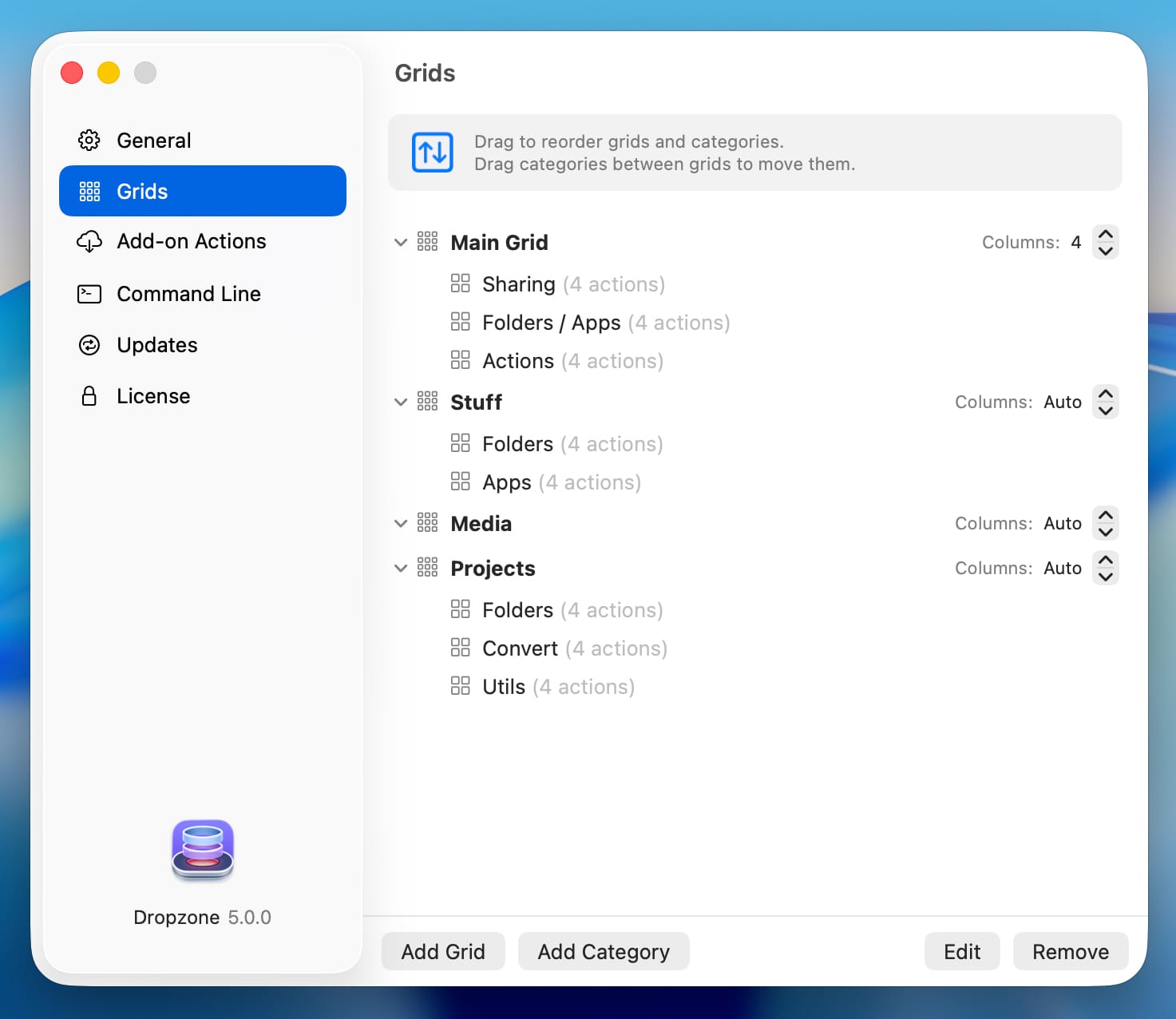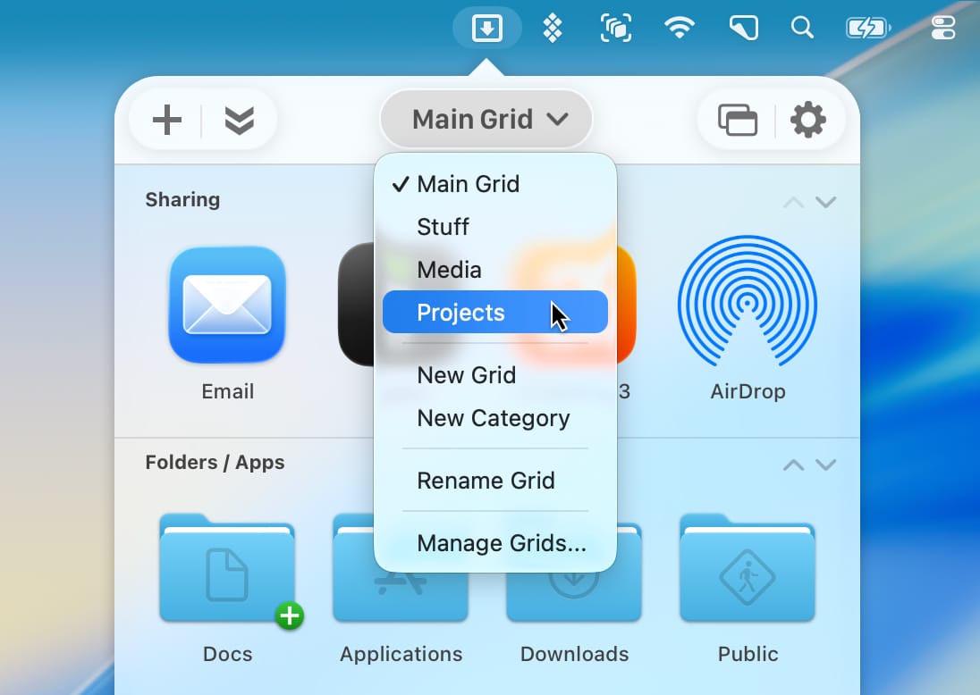 Главным нововведением Dropzone 5 стала поддержка множественных рабочих пространств. Теперь пользователи могут распределять доступные программы и скрипты по отдельным сеткам, привязывая их к конкретным задачам. Например, можно создать основное меню для повседневных приложений и папок, а дополнительные сетки настроить исключительно под специфические рабочие проекты.